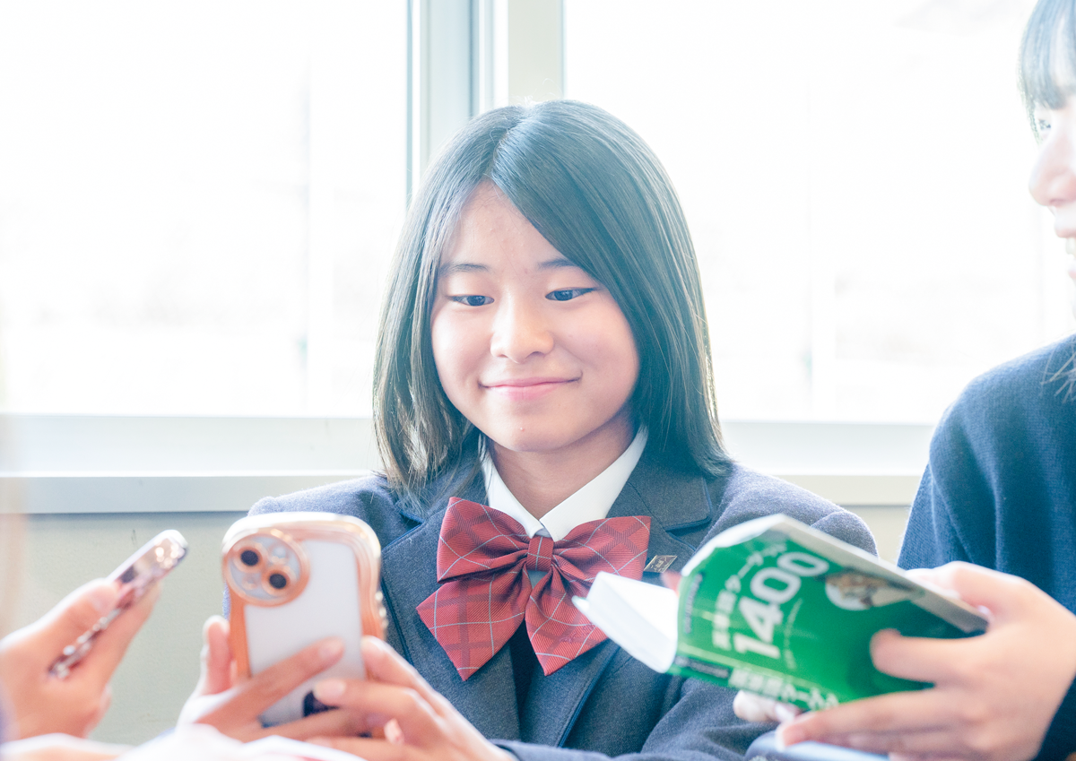 休み時間、昼休み、放課後など、スマホ使用はOKです。理由は、スマホの正しい使い方、スマホリテラシー(マナー・モラル)を身につけてほしいからです。また、授業と休憩のON/OFFの「切り替え力」の養成にも役立っています。授業中は我慢。休み時間は、自由に使う。メリハリのついた学校生活を過ごせています。切り替えの出来る人が、大学で活躍し、社会で活躍します。スマホを自由に使い、楽しみながら、社会に必要なスキルを自然と身につけてください。